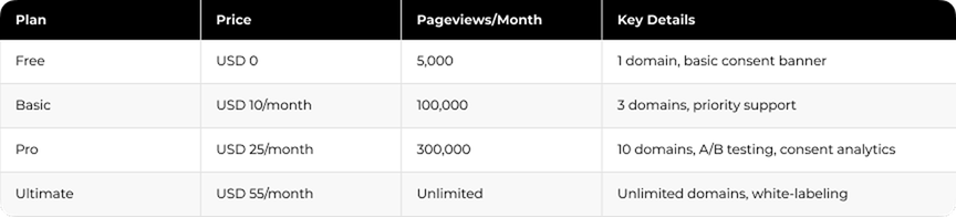 The free version includes cookie banners and policies with a limit to one privacy law. Premium adds A/B testing, consent statistics, multi-region support, and Google Consent Mode v2.